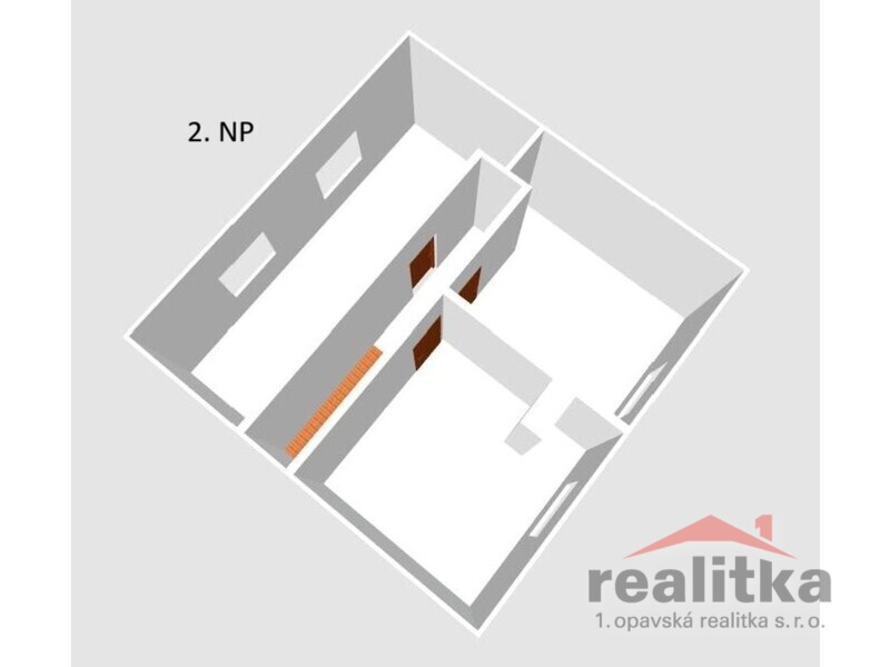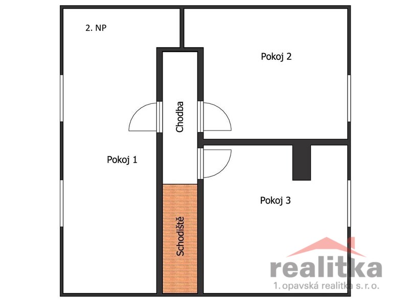 V patře je schodiště, chodba a 3 pokoje.