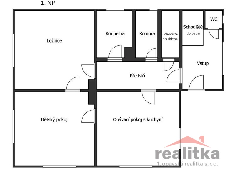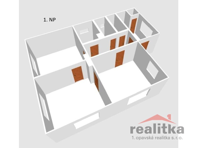 předsíň, obývací prostor s kuchyňským koutem, ložnici, další pokoj,