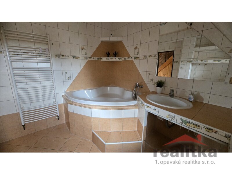 varná deska. V koupelně je rohová vana, umyvadlová sestava a napojení na