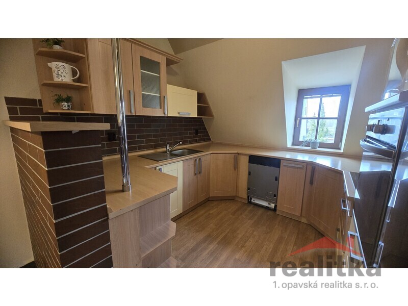 Kuchyň je do tvaru U, je zde lednice s mrazákem, myčka, trouba, digestoř,
