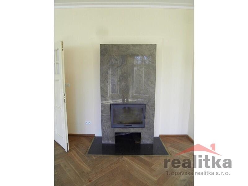 pokoji jsou funkční krbová kamna, jinak je byt vytápěn plynovým kotlem.