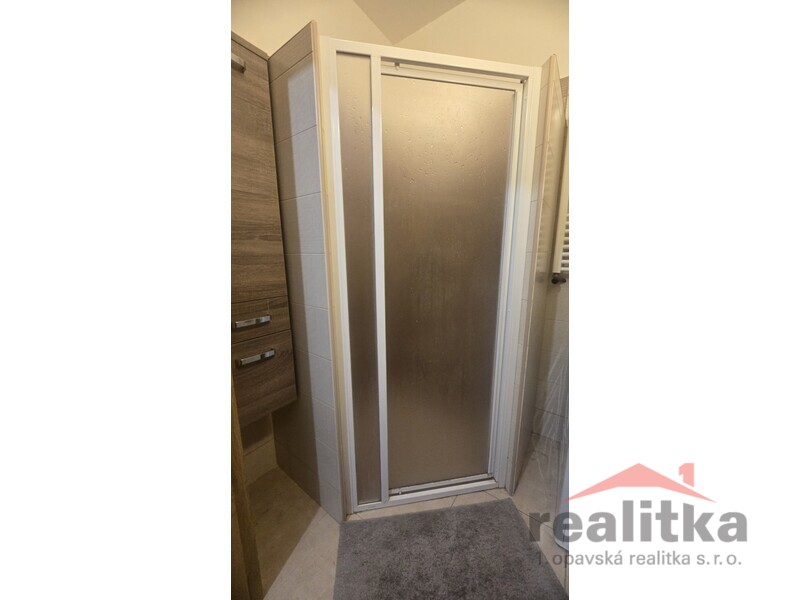 V koupelně je sprchový kout, skříňka, umyvadlová sestava, pračka. Wc je