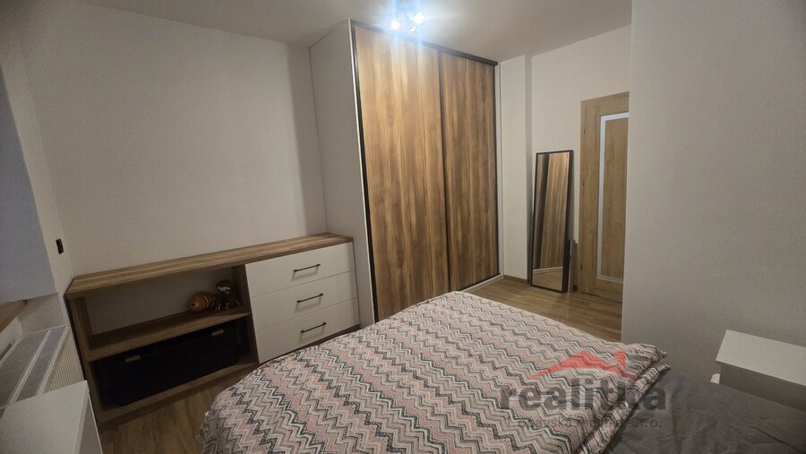 zařízený. Je zde ložnice – vestavěné skříně, komoda, noční stolky,