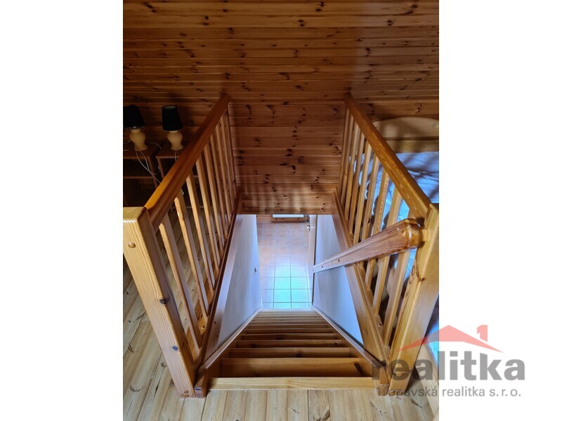 stolem a přes dřevěné schodiště se vstupuje do horní části bytu, kde je